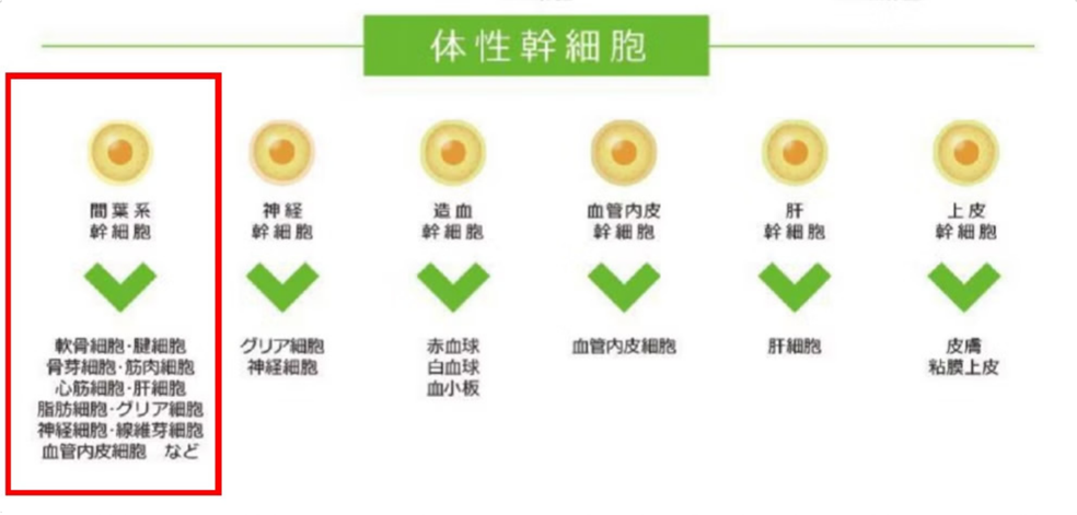 体性幹細胞は、他の幹細胞より分化能が⾼くないといわれておりますが、上記のように⾮常に多種の細胞に分化することができるため、⾮常に多くの疾患へ治療効果が期待されます。