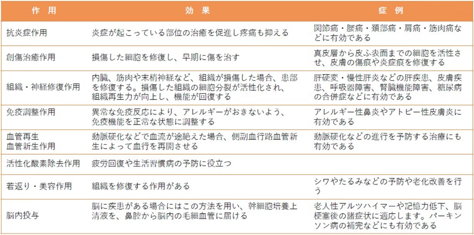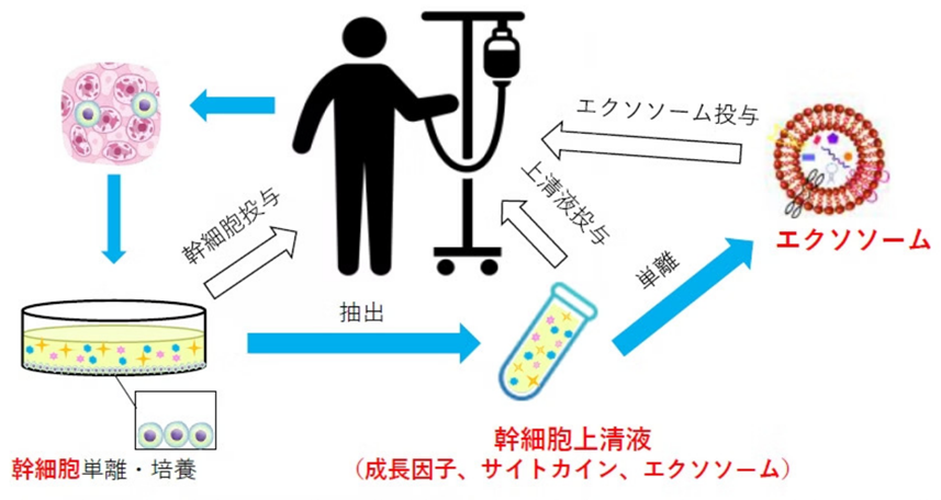 また、幹細胞の培養過程で得られる成⻑因⼦・サイトカイン・エクソソームを含む幹細胞上清液は幹細胞治療と同等の効果があると期待されております。